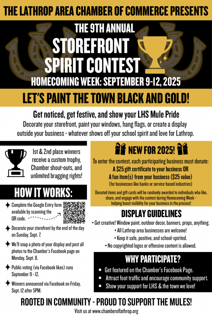 Decorate your storefront, paint your windows, hang flags, or create a display outside your business — anything to show off your school spirit and love for Lathrop!